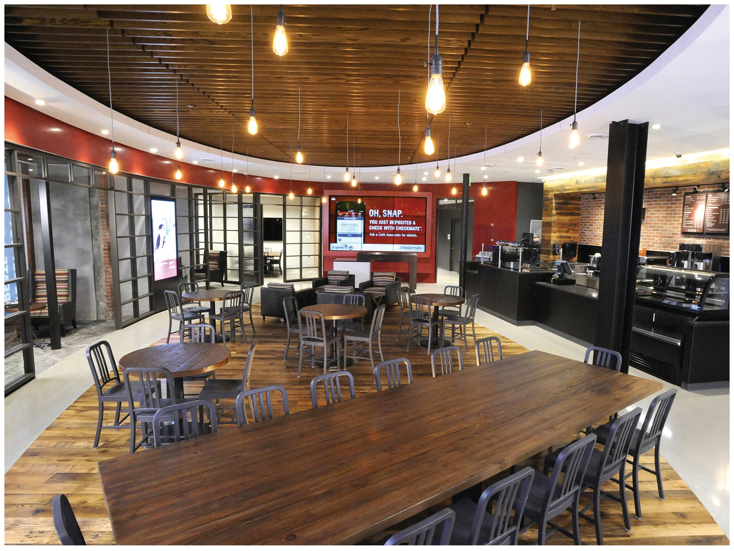The 360 Cafés were designed to be warm and inviting with comfortable armchairs, fresh brewed coffee, digital interactive screens, and flex spaces that could support local start-up, small business and community initiatives.